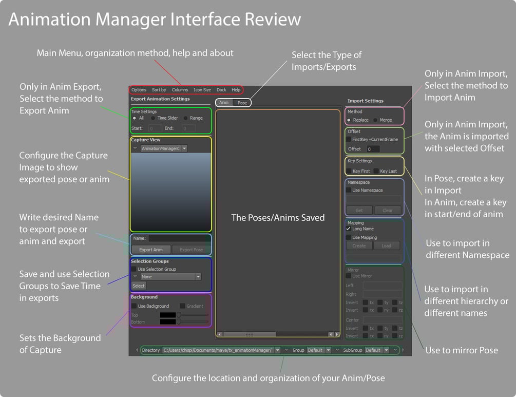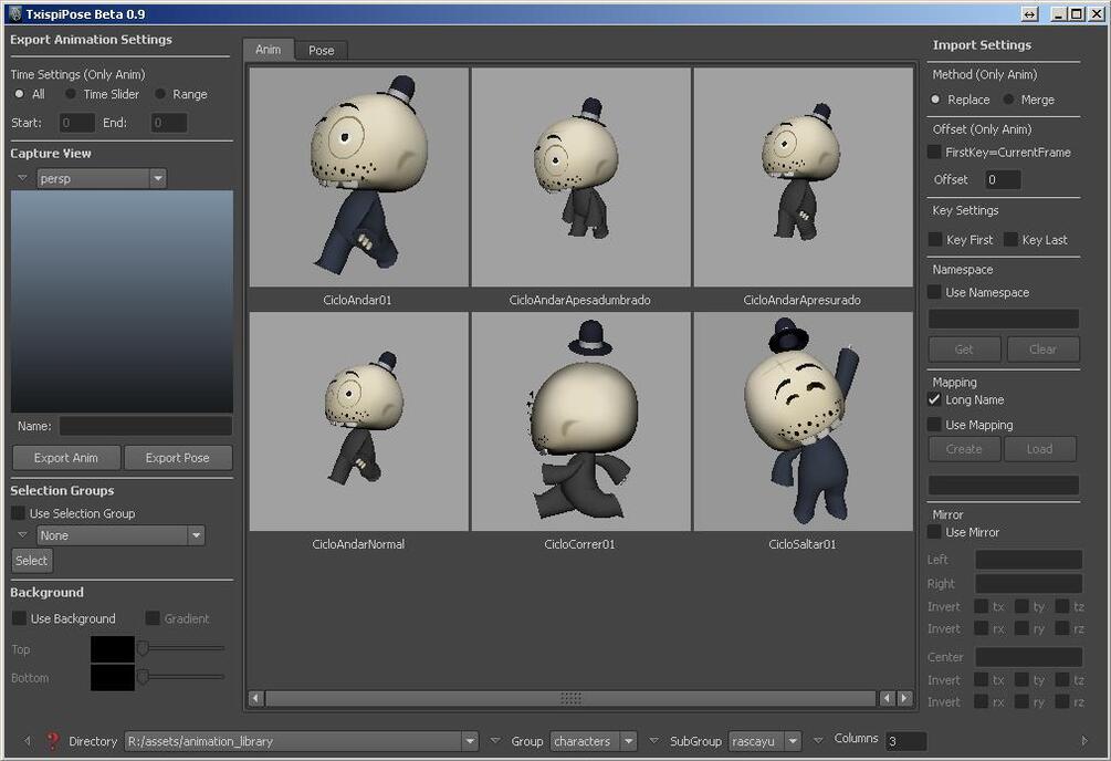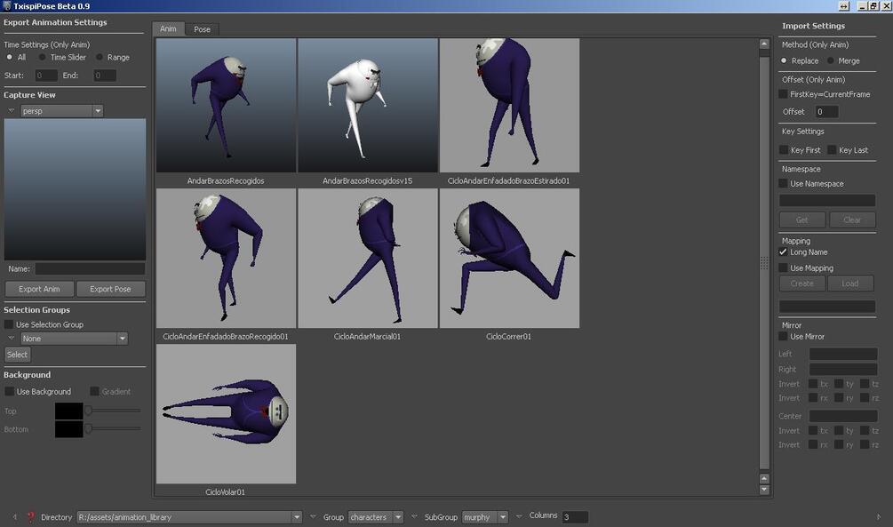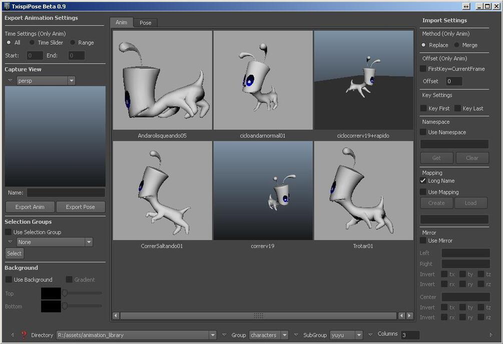 Manage animations, poses and selections and organize in Directories, goups and subgroups.